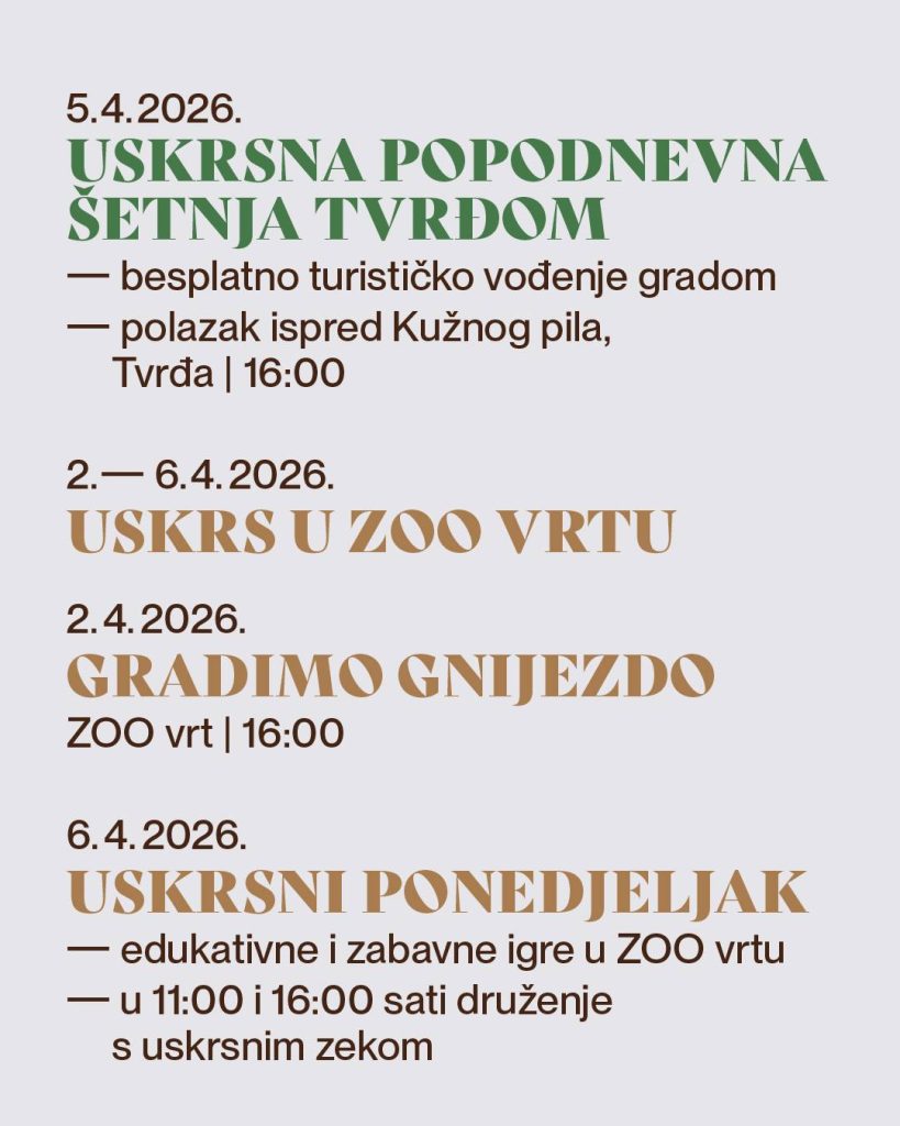 4.4., Uskrs u Osijeku: Uskrsni sajam – na Veliku subotu od 9 do 13 sati na glavom trgu se uz tradicijski sajam na kojemu će se predstaviti i uskrsni običaji nacionalnih manjina, priređuju i dječje radionice izrade uskrsnih čestitki, www.tzosijek.hr, www.facebook.com/TZ.Osijek